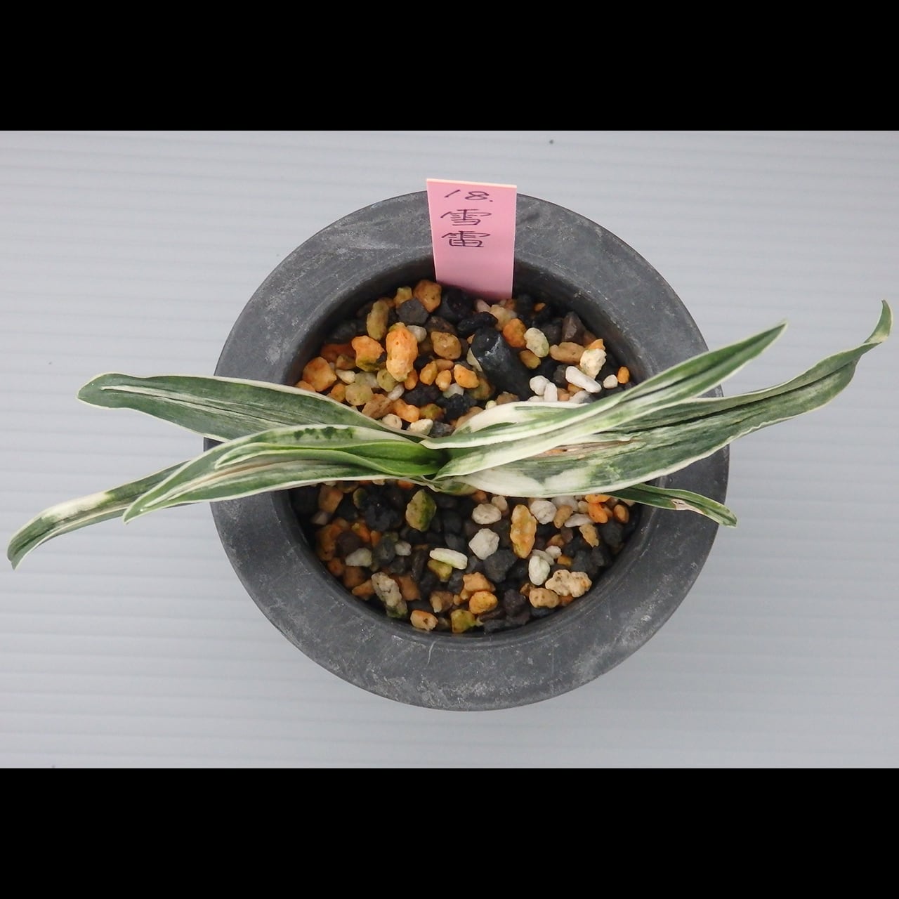 A small cultivar of the shimakou line. To bring out its snow-white yahazu torafu (herringbone variegation, though it can take any shape), give it plenty of fertilizer, light, and wind.