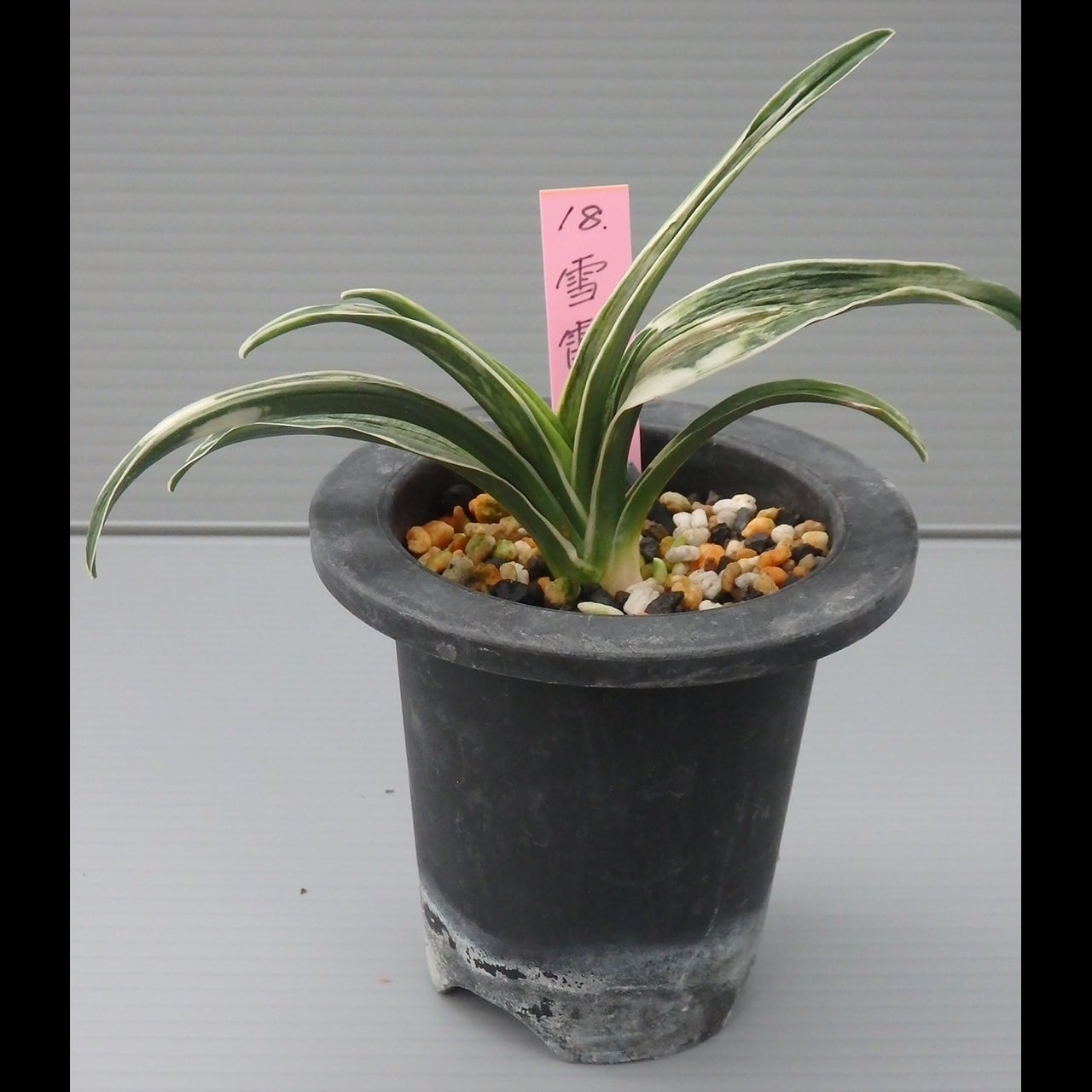 A small cultivar of the shimakou line. To bring out its snow-white yahazu torafu (herringbone variegation, though it can take any shape), give it plenty of fertilizer, light, and wind.