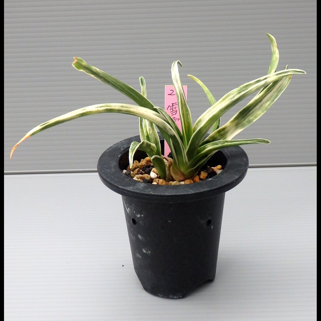 A small cultivar of the shimakou line. To bring out its snow-white yahazu torafu (herringbone variegation, though it can take any shape), give it plenty of fertilizer, light, and wind.
