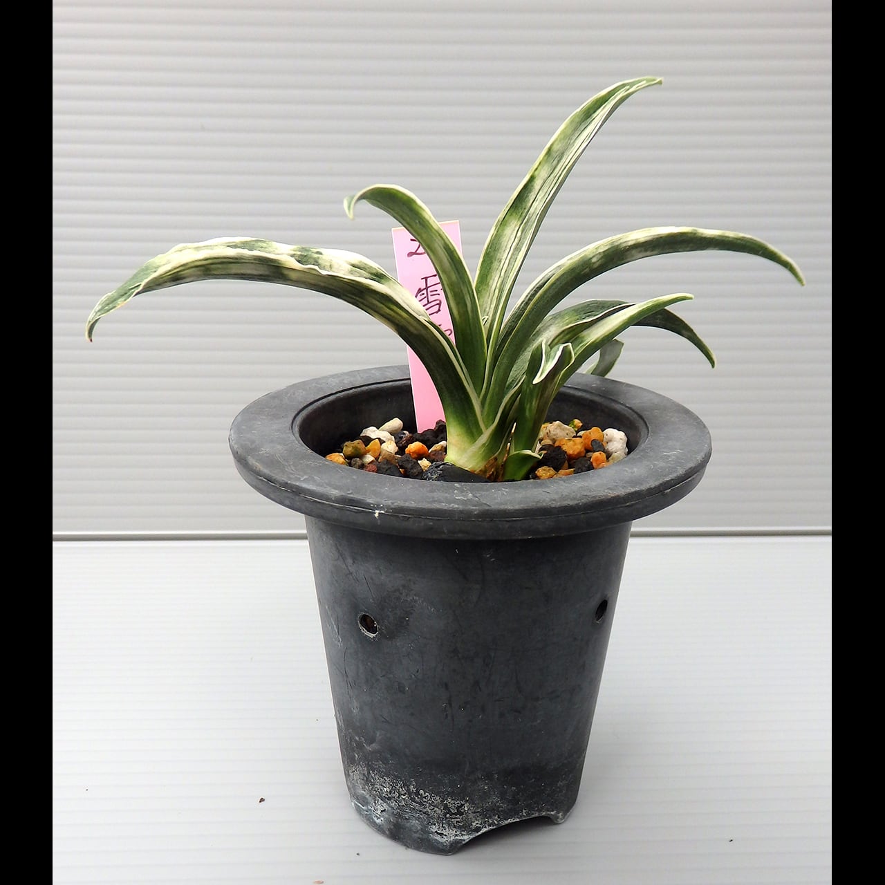 A small cultivar of the shimakou line. To bring out its snow-white yahazu torafu (herringbone variegation, though it can take any shape), give it plenty of fertilizer, light, and wind.