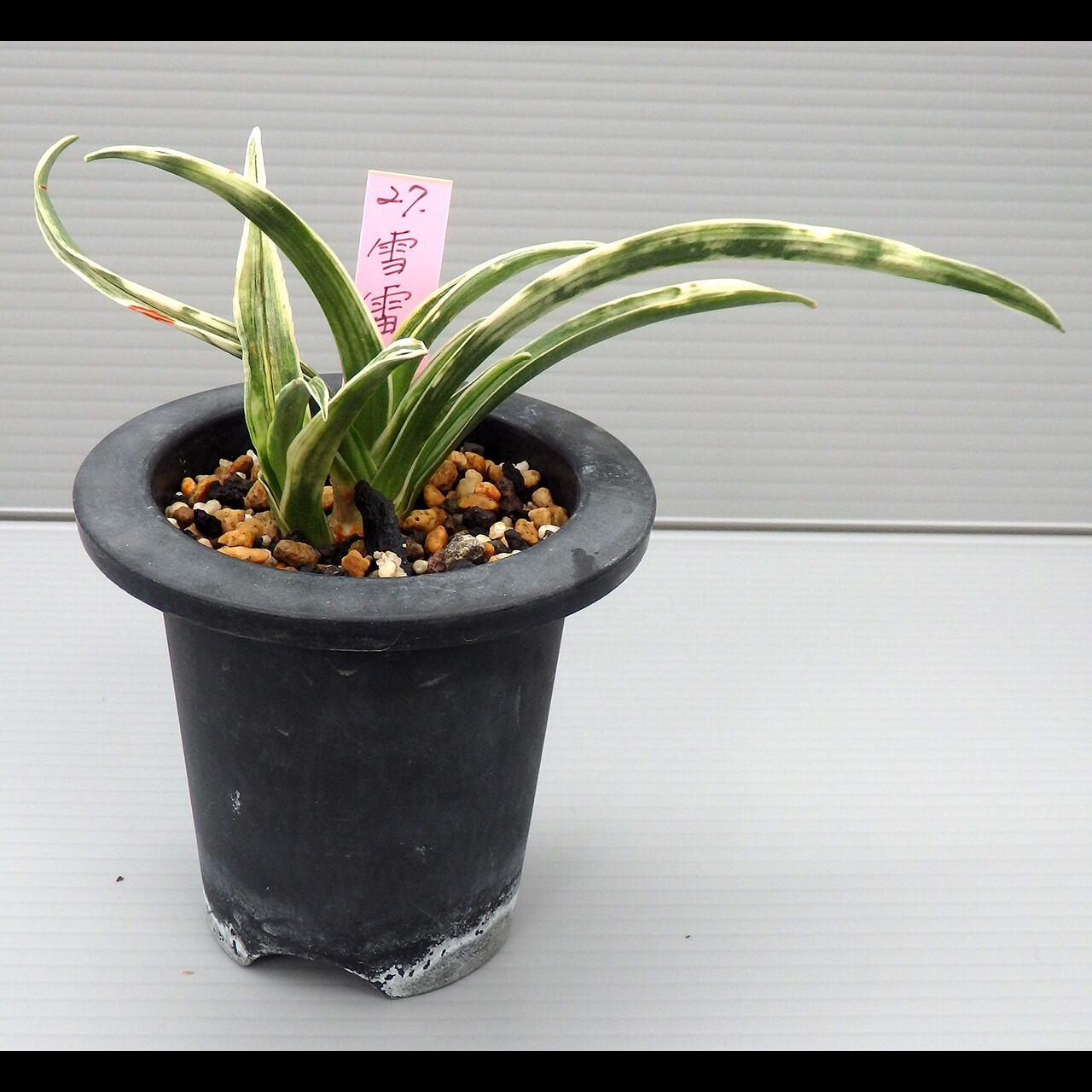 A small cultivar of the shimakou line. To bring out its snow-white yahazu torafu (herringbone variegation, though it can take any shape), give it plenty of fertilizer, light, and wind.
