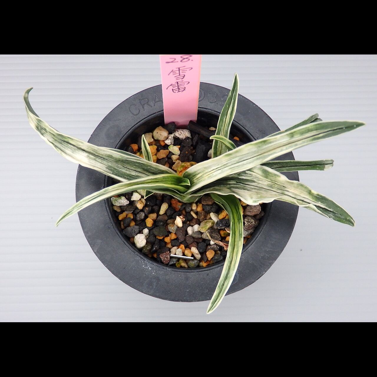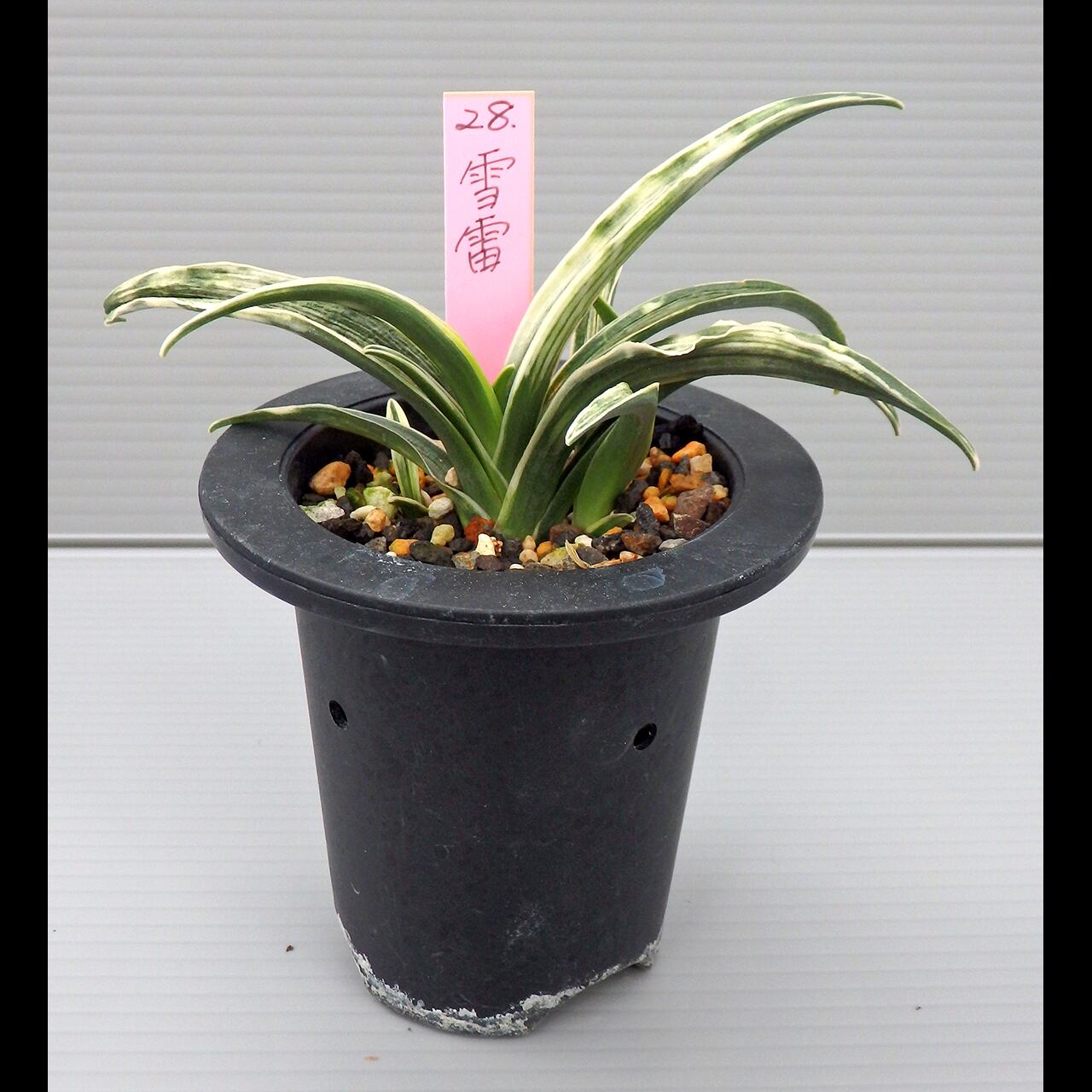 A small cultivar of the shimakou line. To bring out its snow-white yahazu torafu (herringbone variegation, though it can take any shape), give it plenty of fertilizer, light, and wind.