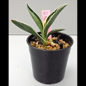 「晃明殿」型の大型羅紗品種。葉先の尖る葉肉の厚い中立ち葉に、深い白覆輪と総雅糸竜、剣葉などの芸を現します。
