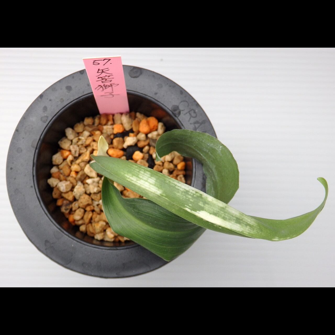 A shishi variety with yahazu torafu (white variegation in a herring-bone pattern). The herring-bone pattern is more distinct on the back side of the leaves.