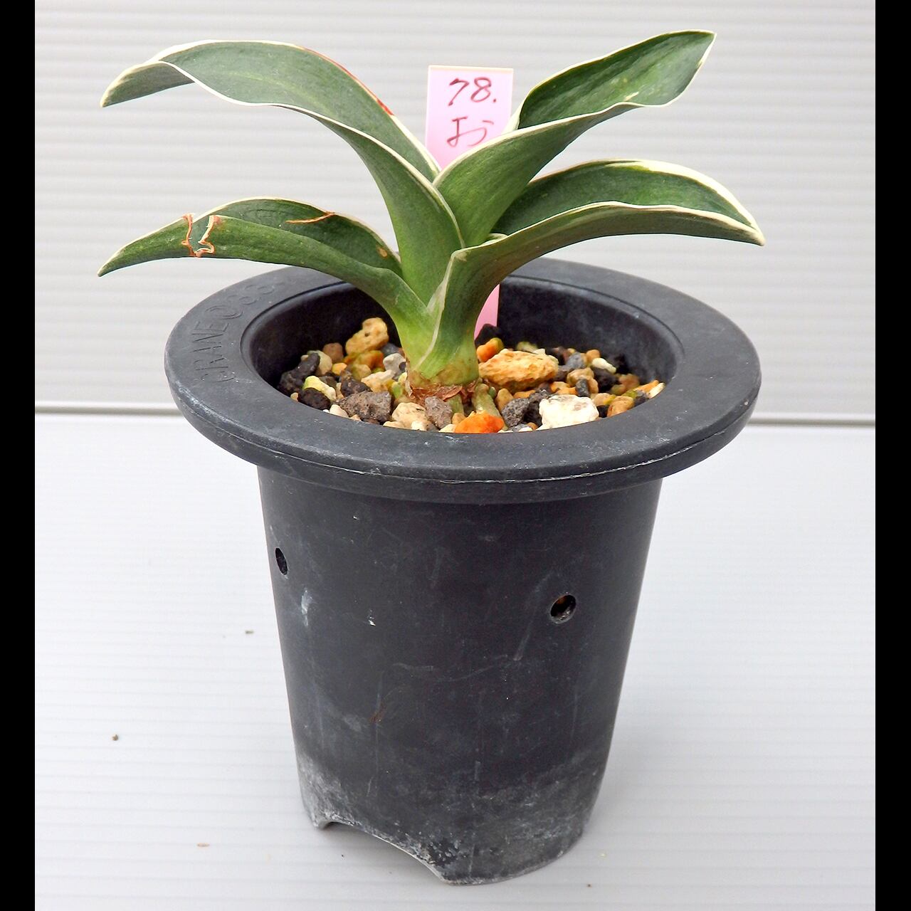 One of the best-known maruba (round-leafed) rasha varieties. It will not manifest any strong hagei (formal mutation), except for noshiha (leaves with both sides folded in) and occasional gashiryu (multiple lengthwise ridges), but deep green surrounded by white fukurin (variegation around the edges) emits graceful beauty.