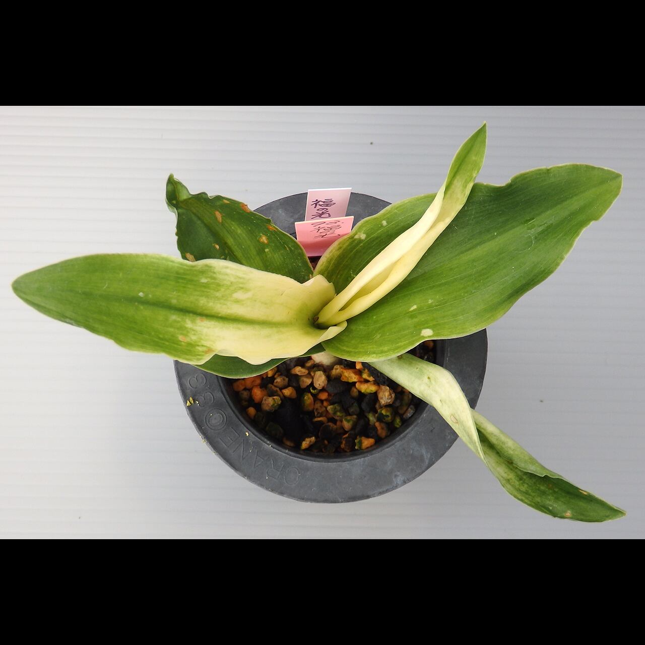 A small usuha variety. The yellowish white akebonofu (variegation at the bottom of the leaves) stands out on its round contour. The leaf edges are slightly wavy.