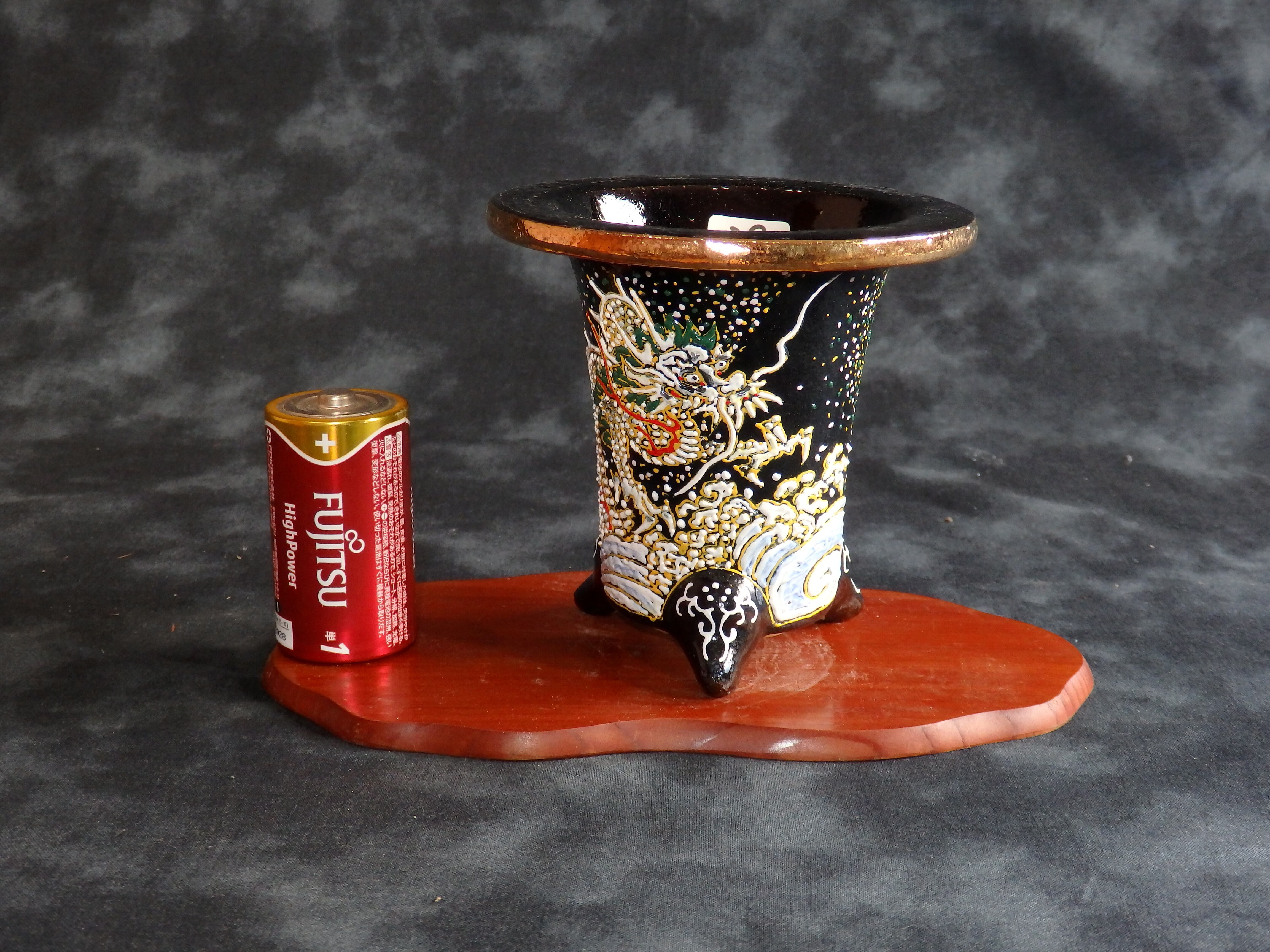 A nishikibachi is a decorative pot commonly used for exhibitions. Traditionally, pots of this shape were used for Omoto, but the current trend is to use them for Fukiran (Vanda/Neofinetia falcata) and succulent plants as well. This one was made by Airakuen, one of the best known nishikibachi (decorative pot) makers in Japan, if not in the world.
