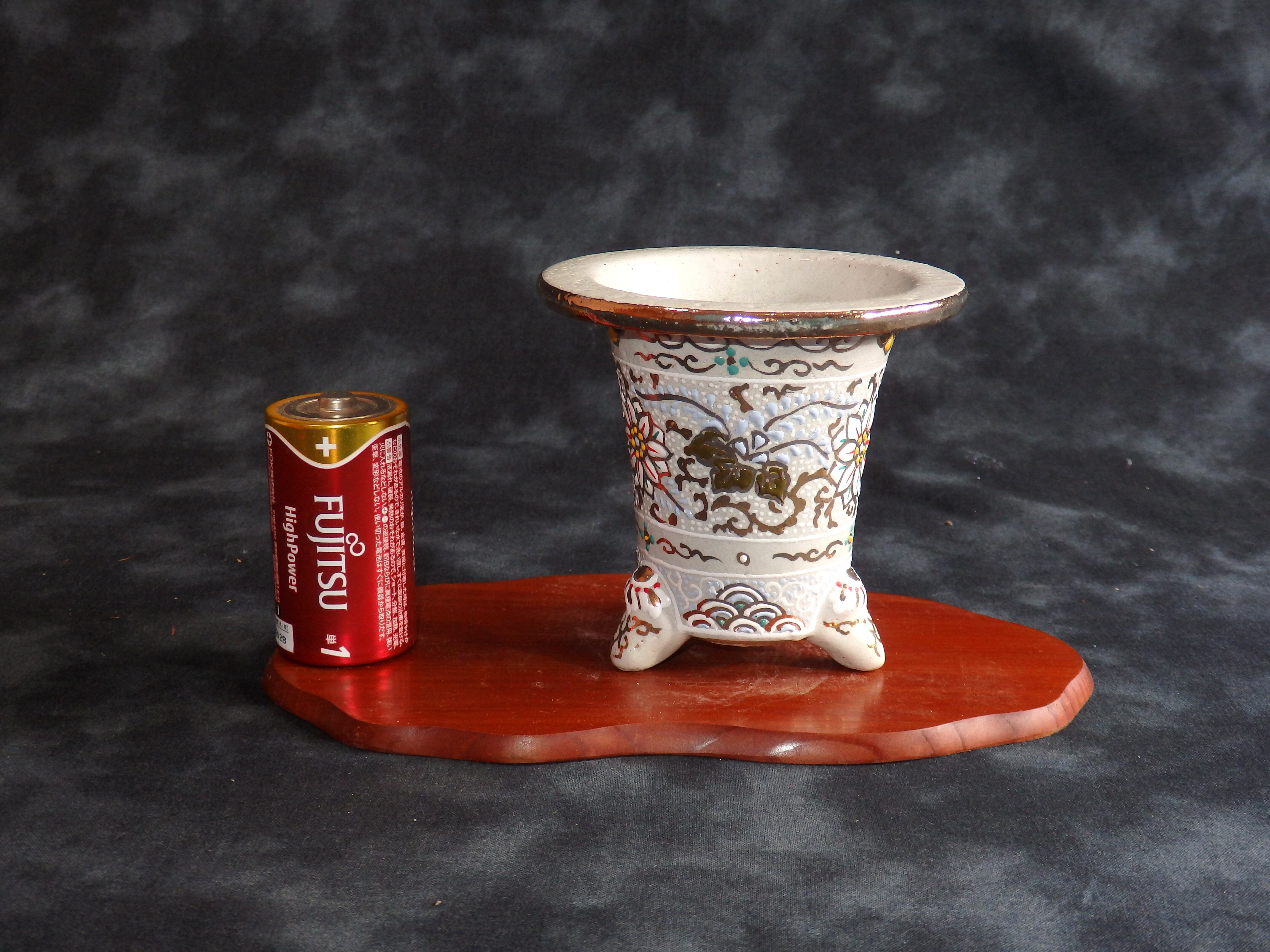 A nishikibachi is a decorative pot commonly used for exhibitions. Traditionally, pots of this shape were used for Omoto, but the current trend is to use them for Fukiran (Vanda/Neofinetia falcata) and succulent plants as well. This one was made by Airakuen, one of the best known nishikibachi (decorative pot) makers in Japan, if not in the world.