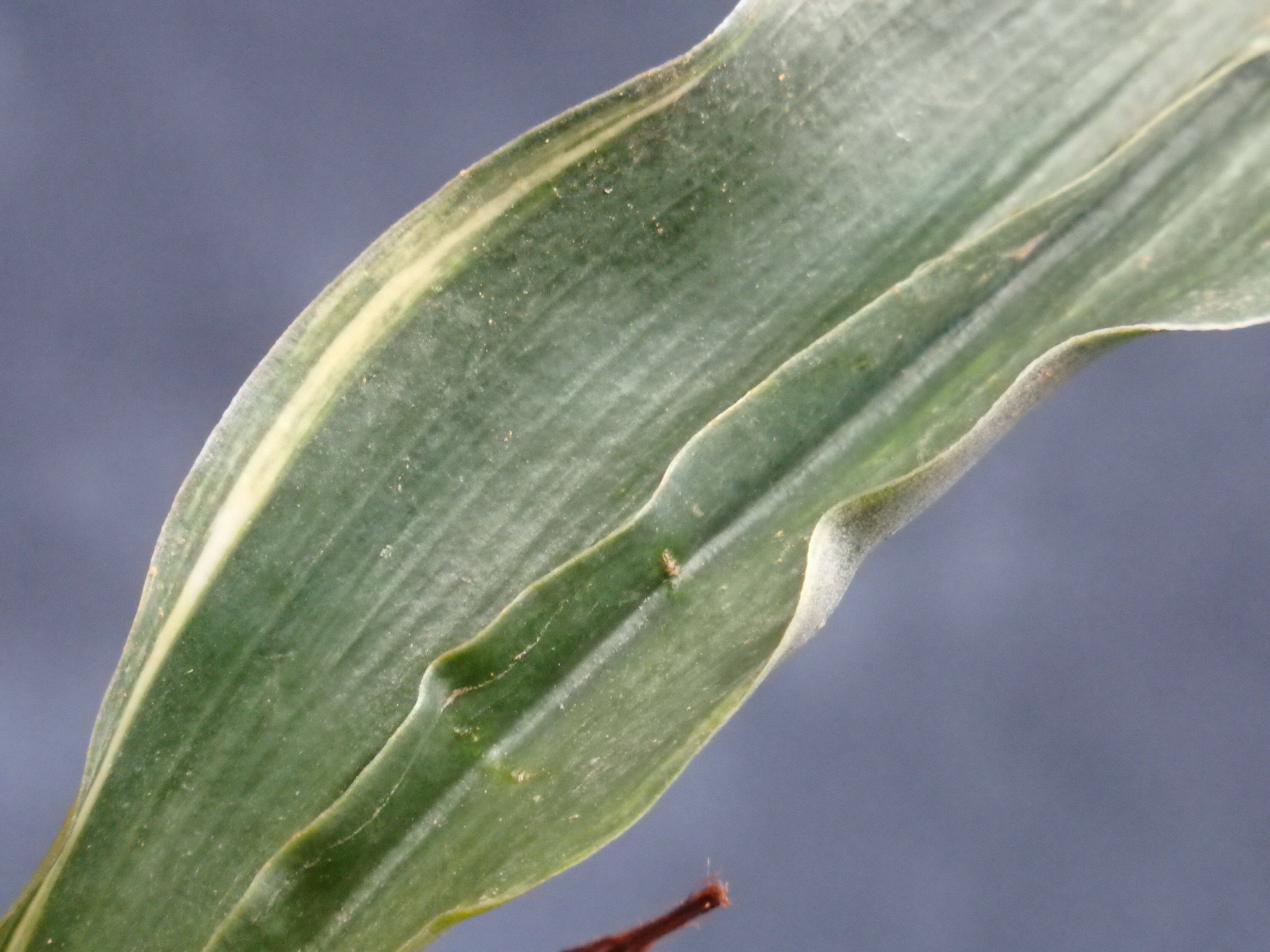 実生苗ですので、この株はもはや「松谷千代田」ではありませんが、上記の「松谷千代田」を特徴づける葉芸を表す可能性が高く、またこれを実親として使った場合、千代田斑をもつ実生苗が生まれる可能性があります。