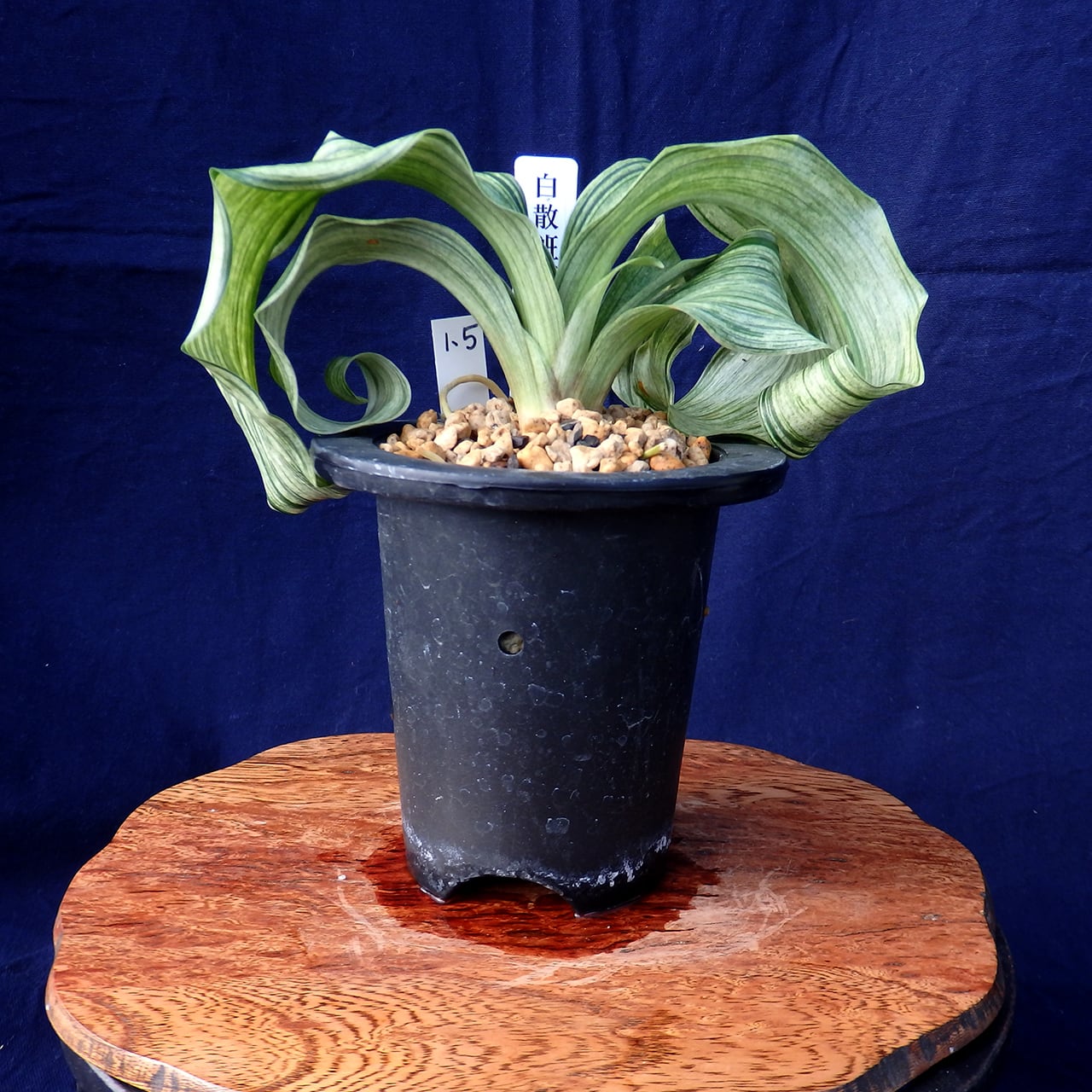 A shishi variety (curly leaves) with shirafu (a type of chiyodafu, white variegation in fine white streaks, with borders a little blurred). Not registered yet, with no cultivar name, but good variegation and nicely curled leaves.