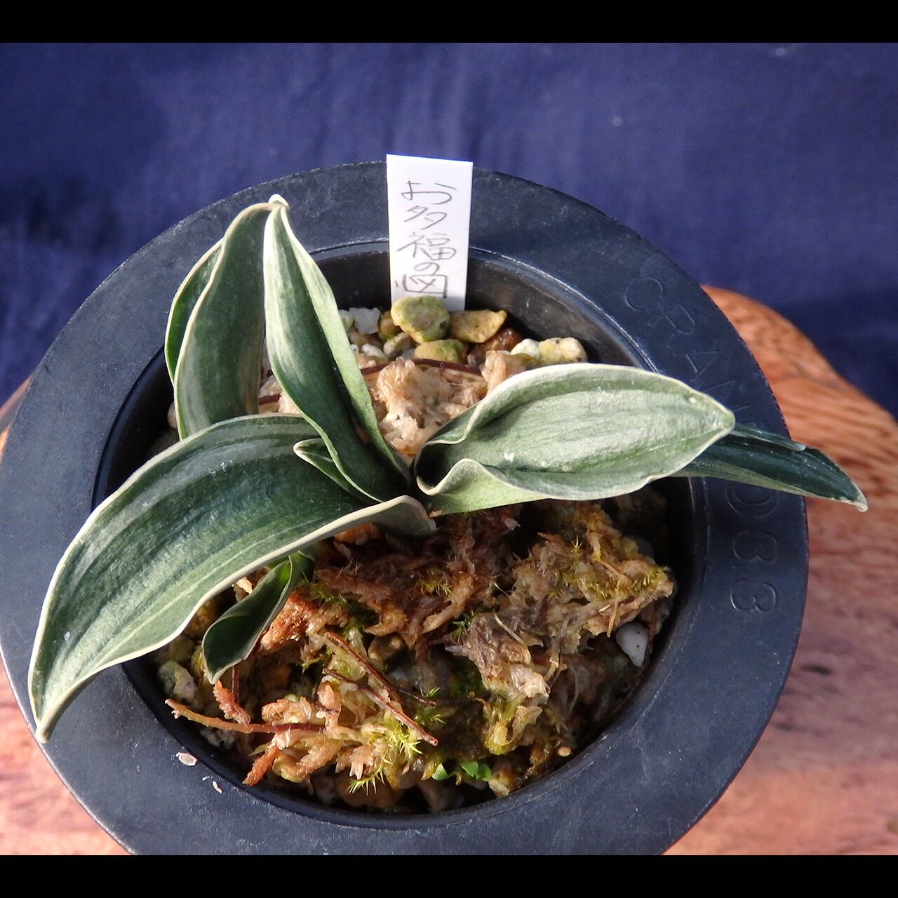 The label in the picture says 'Otafuku no Zu,' but since the zu (irregular blotches of white variegation) on this plant is not quite distinct enough, we call it 'Otafuku.' Unlike 'Zuisen,' 'Otafuku no Zu' is a registered cultivar independent of 'Otafuku,' and is more highly valued. This plant may or may not develop more distinct zu. Keep your fingers crossed!