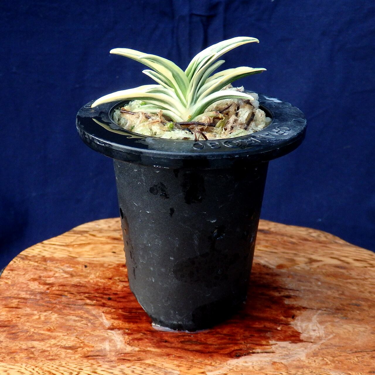 A small rasha variety. The pointy leaves with pure white fukurin (variegation around the edges) will overlap one another in an orderly manner and turn downward. They will develop kouryu (lengthwise ridge), noshiha (leaves with both sides folded in), and, on occasions, kenba (sword-like narrow leaves). As the plant grows old, the leaves will be covered with sougashiryu (lengthwise ridges all over the leaves).